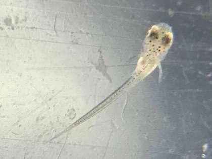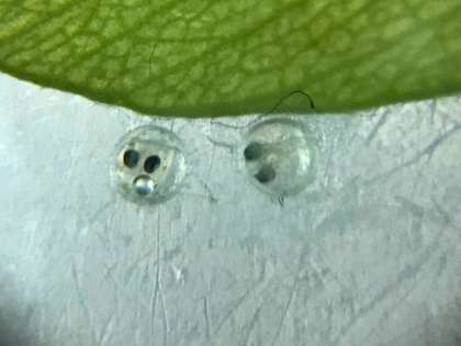 水草に産み付けていた卵や,孵化した幼魚を,解剖顕微鏡を使って観察しました。初めて使う実験器具ですが,卵にピントが合った時には歓声が上がっていました。