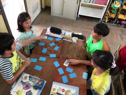 「What do you have on Monday?」の学習の中で,教科名の書かれたカードを使って神経衰弱をしました。