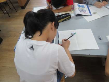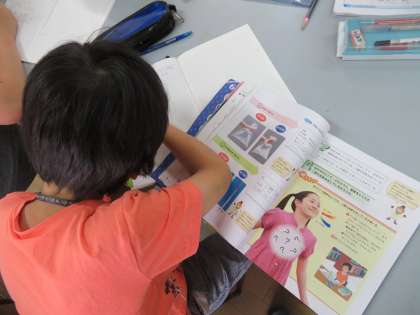 教科書を使って,吸った空気の行方を調べました。