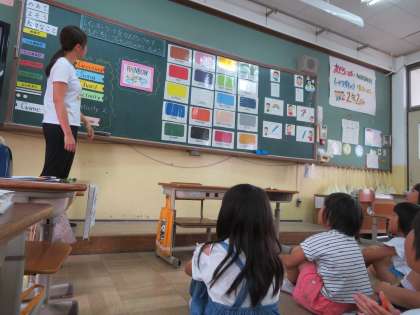 色の言い方をたくさん聞き,言い慣れた表現を使って,レインボーカードを作成しています。