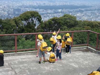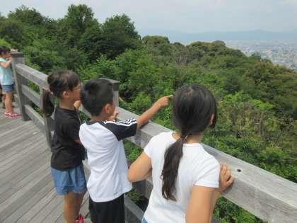 社会見学で将軍塚へ行きました。京都市内を一望できる青龍殿の大舞台で京都タワーや御所,鴨川デルタ,平安神宮など,京都のたくさんのものを見ることができました。
