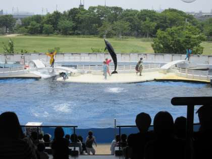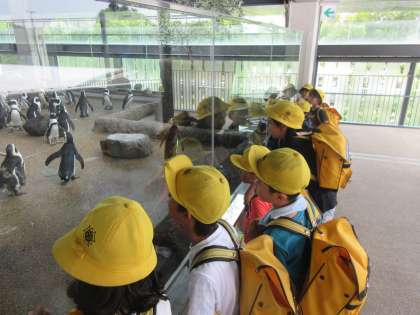 イルカショーを見たあと,クラスごとに各展示ブースを見て回り,オオサンショウウオやクラゲ,ペンギンなどたくさんの生き物を見ることができました。