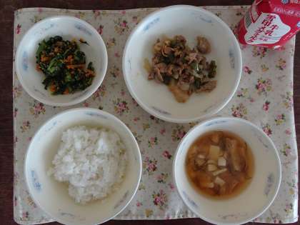 今日の献立は,ごはん・牛乳・豚肉と万願寺とうがらしのいためもの・だいこん葉のごまいため・もずくのみそ汁です。