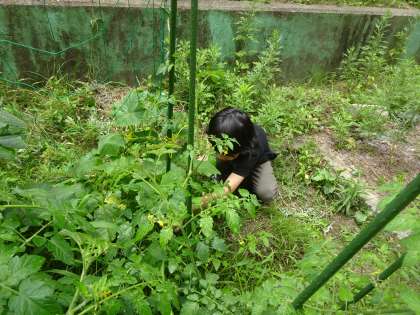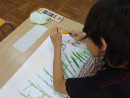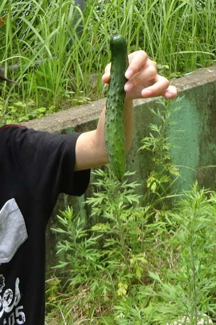 ひまわり学級の畑で育てている野菜の収穫が始まっています。今日はキュウリの収穫をしました。「大きくなったね。」「毎日水やりを頑張って良かったね。」など,児童のうれしそうな様子が印象的でした。収穫後,さっそく収穫の思い出を絵に描いて残しました。