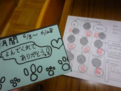 今月は読書月間です。その活動の一つである,読書ビンゴにひまわり学級の児童も取り組んでいます。読んだ本を項目ごとにチェックして,全部そろうと賞品のしおりがもらえます。今日は5年生児童がビンゴ達成しました。「がんばったよ。」「うれしいな。」「これからも本を読もう。」など,読書に意欲的な姿が見られました。