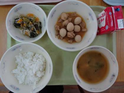 今日の献立は,ごはん・牛乳・鶏肉のさっぱり煮・小松菜と切干大根の煮びたし・みそしるでした。