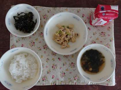 今日の献立は,ごはん・牛乳・きつね丼の具・小松菜とひじきのいためもの・みょうがのみそしるです。