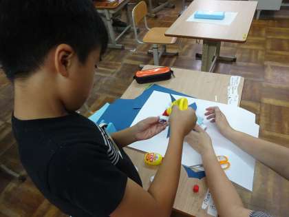 身近な材料を使って貯金箱を作りました。牛乳パック,ペットボトルに色画用紙やマジックを使って,世界に一つだけの貯金箱を作ります。「動物の貯金箱にしようかな。」「僕は飛行機の貯金箱にしよう。」など,設計段階から楽しんで取り組む児童の姿が印象的でした。各々の個性が表れた,素敵な貯金箱の完成です。