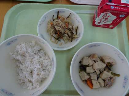 今日の献立は,麦ごはん・牛乳・高野どうふと野菜のたき合わせ・ごま酢煮です。