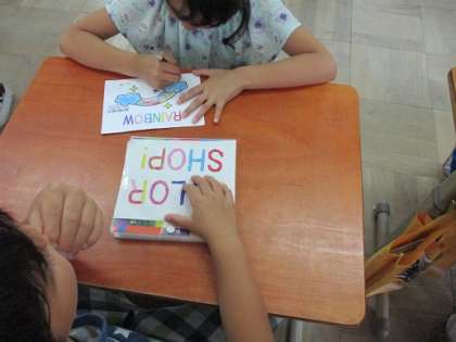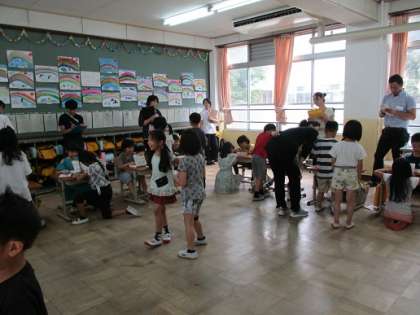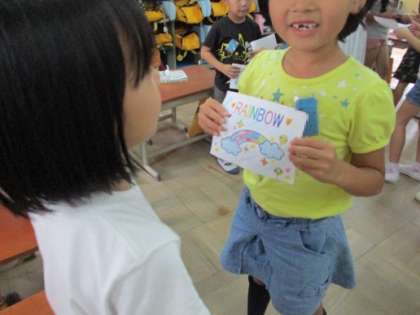今日は,他校の先生方が,2年生の英語活動の授業を見に来て下さいました。今日は,オリジナルレインボーカードを完成させて,友達にプレゼントするという活動内容でした。みんな,楽しそうに生き生きと英語をつかってやりとりをする姿がありました。素敵なカードが完成しました!友達からプレゼントされて笑顔がいっぱいの1時間でした。