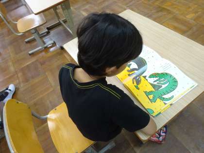 ひまわり学級の児童は読み聞かせが大好きです。1日の中で一度は本に関わる機会を作っています。一方,高学年児童は,自分の力で本を読む習慣を徐々につけ始めようとしています。読み聞かせで読んでもらった本や,好きなものが登場する本をきっかけに,1人で本を読む練習に取り組んでいます。