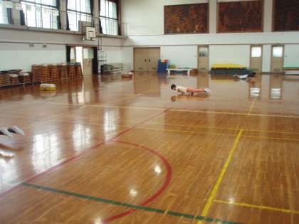 体育館でローラーボードをしました。ローラーボードをお腹の下に敷いて,床の上を転がります。最初の頃に比べると,足もピンと伸びて姿勢が綺麗になりました。「体を真っ直ぐにした方が遠くまで転がるよ。」「みんなで競争しよう。」など,楽しみながら活動することができました。