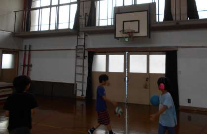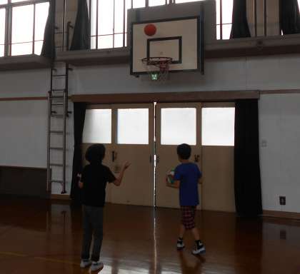 体育館でボールを使った運動をしました。バスケットゴールに向かってシュートを撃ちます。「難しいな。」「コツがあるよ。」「僕はドリブルしてからシュートをしてみよう。」など,個々の課題に応じた運動をしました。