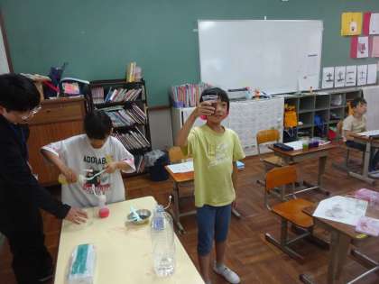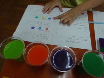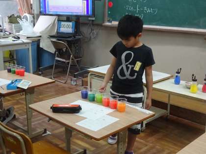 図工科の学習で「ジュースやさんになろう」に取り組みました。赤色・青色・黄色のジュース液の中から,自分の好きな色を選んで,スプーンで量り,水で薄めます。「ぶどうジュースつくりたい。」「オレンジジュース!」など,自分の作りたいジュースのイメージをたくさんふくらませて,いよいよジュースやさんの開店です。「赤色1杯と青色1杯まぜたら,ぶどうジュースできた!」「赤色と黄色でオレンジジュース!」「全部まぜたら泥水やわ。」など言いながら,ワークシートに記録して,できたジュースをならべました。友だちのジュースを見て,「どうやって作ったん?」と聞いたり,友だちのジュースを参考に自分でも試してみたり…いろいろなジュースを作ることができました。