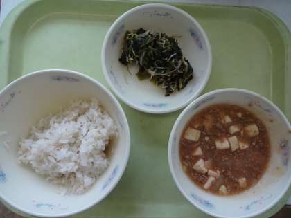 今日の献立は,麦ごはん・牛乳・マーボどうふ・ほうれん草ともやしのいためナムルです。