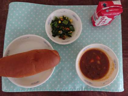 今日の献立は,黒糖コッペパン・牛乳・トマトシチュー・こまつなのソテーです。
