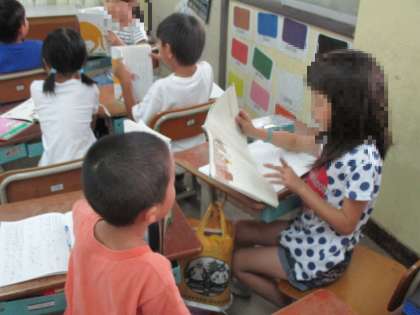 場所や人,季節や行動などあらゆるフレーズを変えてお話クイズを出し合いました。みんな面白い問題を作っていました。「わかった!」「同じ文を選んでる!そんなふうに変えたんだね!」など興味をもって取り組んでいました。