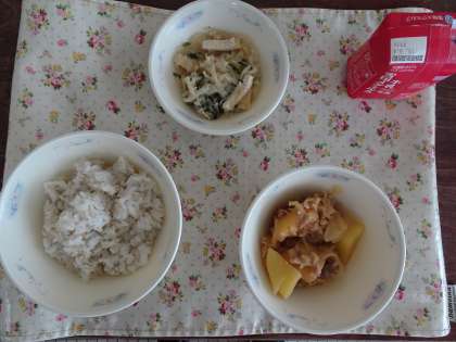 今日の献立は,麦ごはん・牛乳・肉じゃが(ピリカラみそ味)・切干大根の煮つけです。