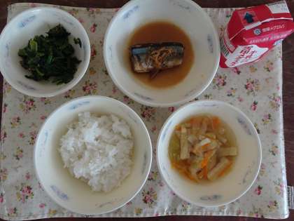 今日の献立は,ごはん・牛乳・さんまのかわり煮・ほうれん草のおかか煮・キャベツのすまし汁でした。