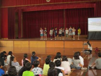 1学期最後の週に,町探検の発表会をしました。体育館に集まって,それぞれのグループがインタビューしてきた内容を2年生みんなで聞きました。どのグループも,全員しっかり言うことができました。