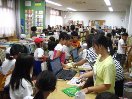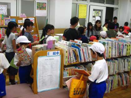 8月28日(水)この雨で外で遊べません。中間休みに「本を読みたい人は図書館があいていますよ・・・」と放送を入れ待ちかまえていると,多くの子どもたちが学校図書館にやってきました。夏休みに借りていた本を返却し,新しく借りる本を手に教室にもどっていきました。
