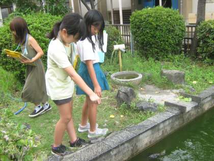 中庭やかめ池に行き,生き物を探してみると,バッタやチョウ,ダンゴ虫などがたくさんおり,元気に活動しているのを見つけることができました。