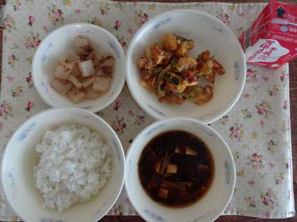 今日の献立は,ごはん・牛乳・夏野菜のかきあげ・かみなりこんにゃく・赤だしです。