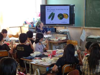 「夏野菜のかきあげ」は夏が旬のゴーヤ・かぼちゃとちくわ・にんじんを使いました。3−2のみんなはゴーヤについてパワーポイントを使って学習しながら,給食を楽しんで食べていました!