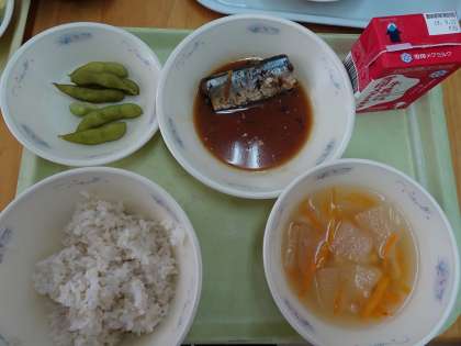 今日の献立は,麦ごはん・牛乳・さんまのかわり煮・えだ豆・とうがんのくずひきでした。