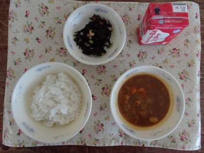 今日の献立は,ごはん・牛乳・チキンカレー・ひじきのソテーです。