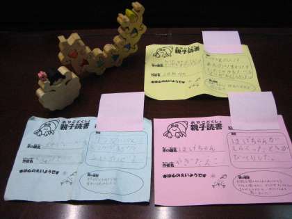 と声をかけています。すると やどかりBOXにまた3枚,親子読書カー