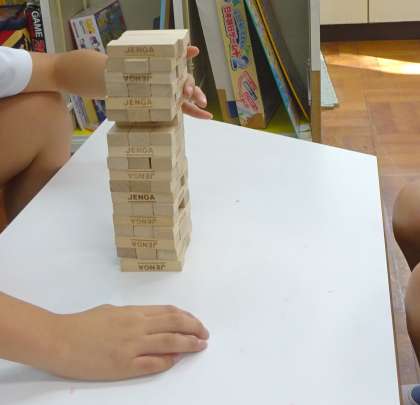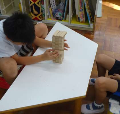 6年生児童と5年生児童が仲良くジェンガをしています。「上手に取ることができたよ。」「焦らず,ゆっくりが大切だね。」「僕は一度に2つ取れるよ。」など,和気藹々としながら指先のトレーニングに取り組むことができました。