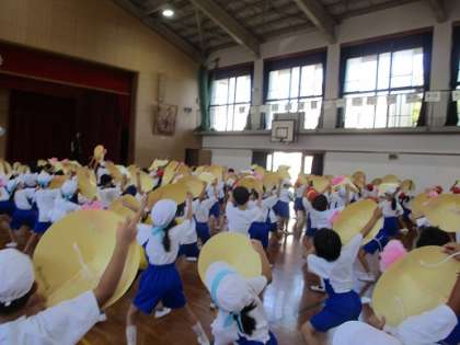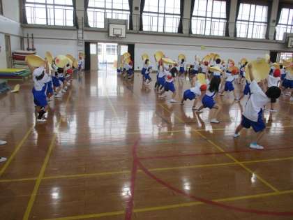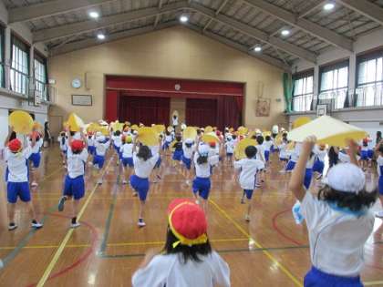 花笠音頭の練習をしています。今日は本番のように並んで踊ってみました。新しい並び方でしたが,並ぶ場所が変わっても張り切って踊ることができていました。来週からは,運動場に出て練習をしていきます。