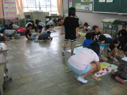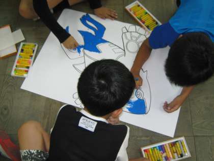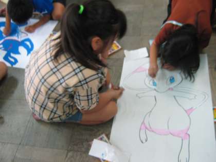 今日は台風の目のコーンに飾るポケモンの絵をみんなで協力して塗りました。