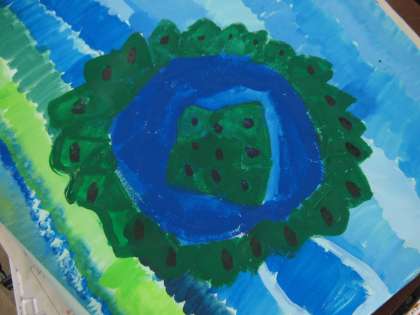 「アマミホシゾラフグ」たちが住む「ミステリーサークル」と海の様子を描いています。