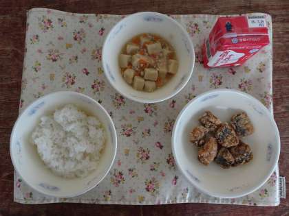 今日の献立は,ごはん・ごはん・いわしのこはくあげ・高野どうふのそぼろ煮です。