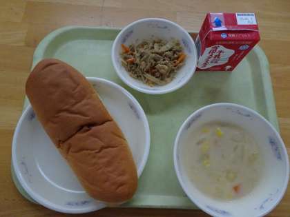 今日の献立は,味つけコッペパン・牛乳・コーンのクリームシチュー・ごぼうのソテーです。