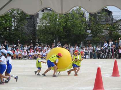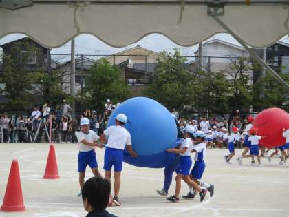 1年生から6年生までが,力を合わせて大きなボールを運びます。