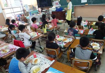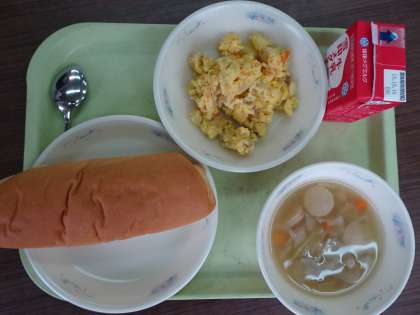 今日の献立は,コッペパン(国内産小麦100%)・牛乳・変わりいり卵・ソーセージと野菜のスープ煮です。