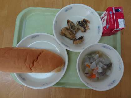 今日の献立は,ミルクコッペパン・牛乳・とびうおの香草あげ・ポトフです。