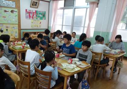 今日は4−3がランチルームで給食を食べました。