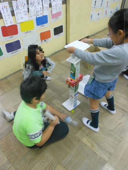 グループで遊びました。空き箱が倒れないように,ドキドキ