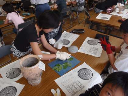 ということで,石器で草を切ったり,本物の土器を触ったりしました。