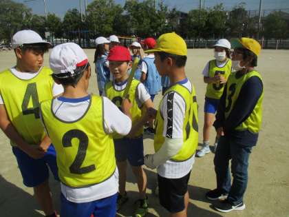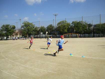 外コースと内コースをつくり,走順に加えてチームでだれがどちらを走るかも考えて取り組んでいます。抜きつ抜かれつの勝負が増えるので,白熱しています。ここからは,バトンパスにも注目していきます。