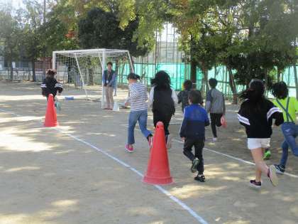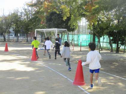 持久走大会に向けた体力作りで,5分間走が始まりました。一番外側を走る5年生,1・3年生に負けず風のように走っています。また,体育委員の子たちはコーンやマーカーの準備もしっかりしていました。