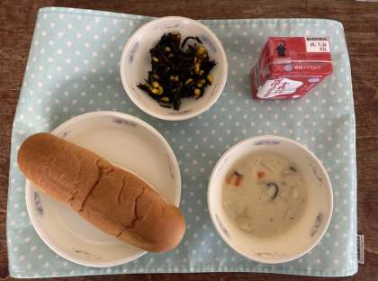 今日の献立は,味つけコッペパン・牛乳・きのこのクリームシチュー・ひじきのソテーです。