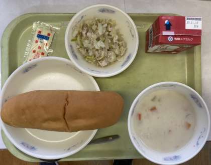 今日の献立は,コッペパン・牛乳・ハムサンドの具・チャウダーです。