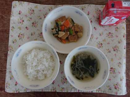 今日の献立は,ごはん・牛乳・厚あげのオイスターソースいため・わかめスープです。