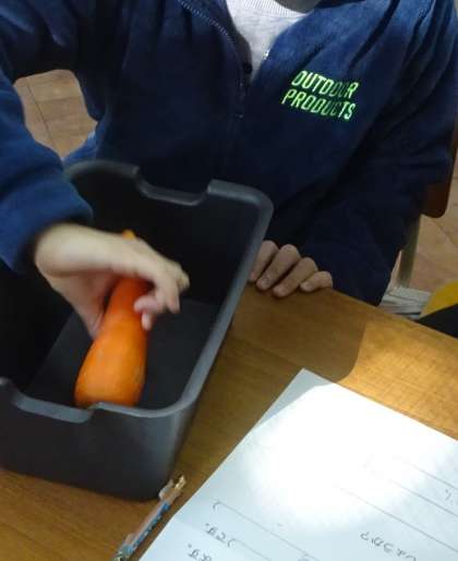 栄養教諭の先生による授業がありました。野菜クイズに挑戦です。見て,触って,においを嗅いで,野菜の特徴を紹介します。「これは何の野菜かな。」「ニンジンかな。」「ナスビかもしれないよ。」「タマネギじゃないかな。」など,たくさん考える児童の姿がありました。学習の後は,ランチルームで給食です。「いただきます。」とみんなで楽しく給食をいただくことができました。