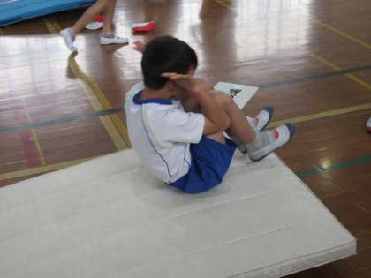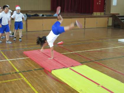前転や後転をきれいにまわる練習をしたり,側転をいろいろな場を使って練習してみたりと自分なりに工夫しながら新しい技に挑戦しています。